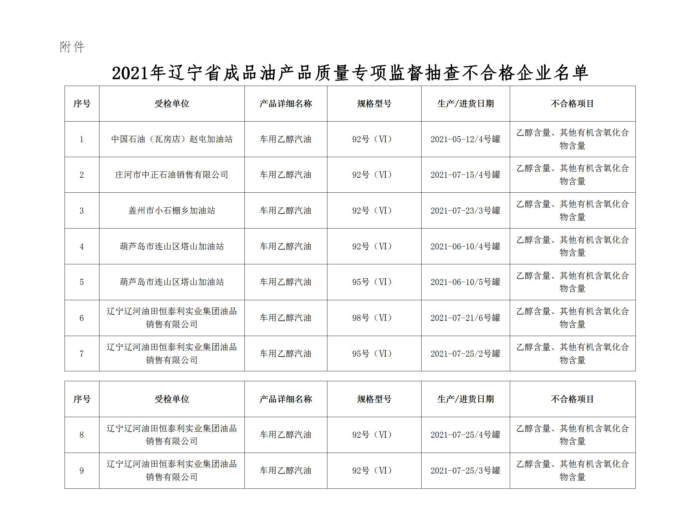 辽宁辽河油田恒泰利实业集团油品销售有限公司销售的2批次92号(Ⅵ)、1批次95号(Ⅵ)、1批次98号(Ⅵ)共计4批次车用乙醇汽油不合格。