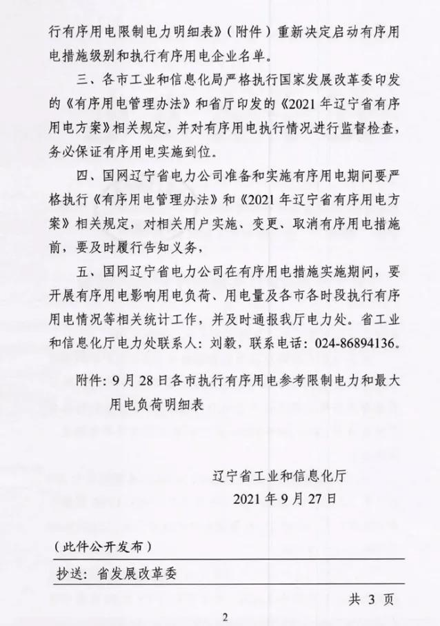 据辽宁省工业和信息化厅网站9月28日消息,辽宁工信厅发布《关于9月28日实施有序用电的通知》称,今日启动实施II级有序用电措施,具体内容如图。