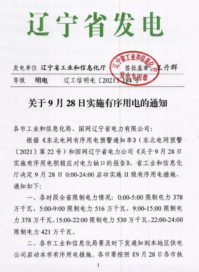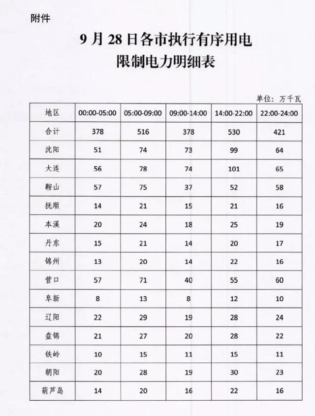 此前,辽宁省工业和信息化厅网站9月27日消息称,根据东北网调预测,9月28日全省最大电力缺口达到530万千瓦,依据国家发改委《有序用电管理办法》,达到严重缺电II级橙色预警信号。决定9月28日0:00-24:00在全省启动实施有序用电II级措施,各时段全省负荷缺口如下:0:00-5:00缺口378万千瓦,5:00-9:00缺口516万千瓦,9:00-15:00缺口378万千瓦,15:00-22:00缺口530万千瓦,22:00-24:00缺口421万千瓦。由于负荷缺口较大,实施有序用电后,仍存拉闸限电风险。