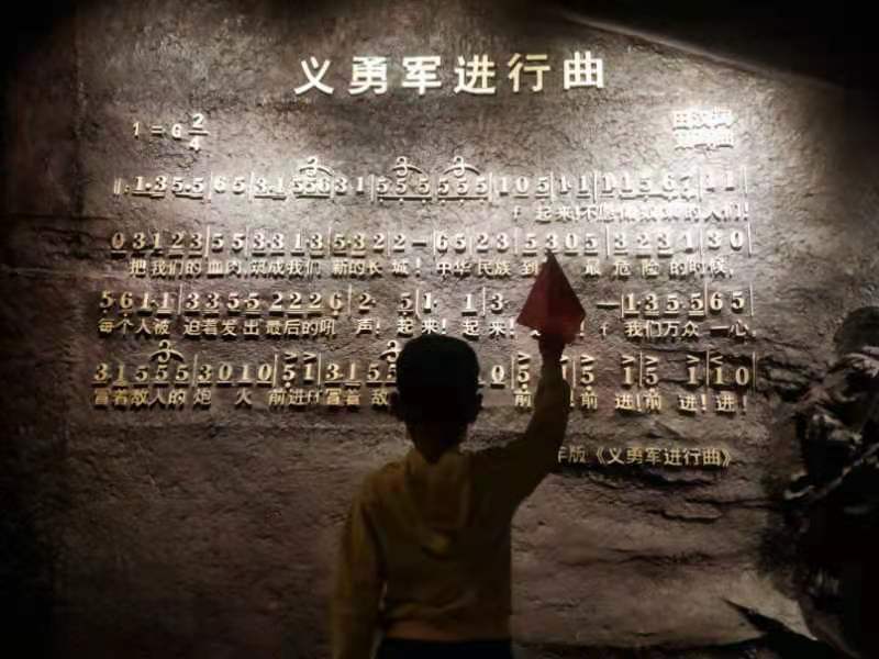 在国歌墙前,一名儿童手拿国旗高唱国歌。记者 田勇 摄