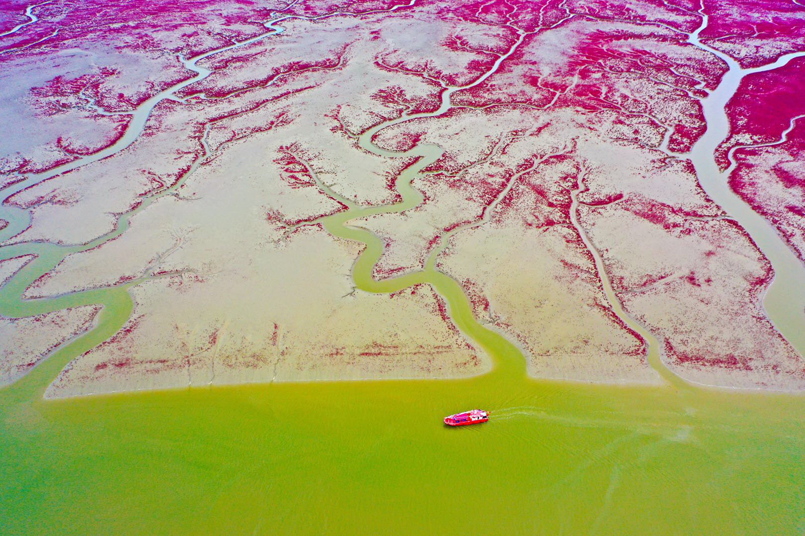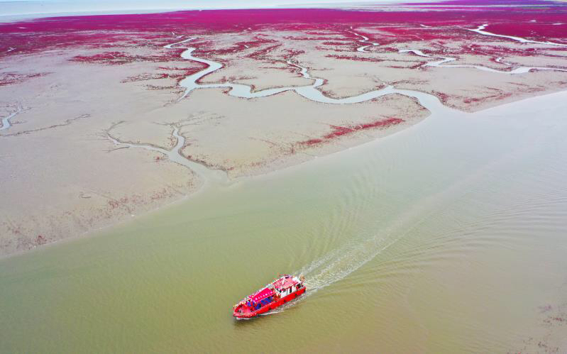 2021年2月初,盘锦红海滩景区开展碱蓬草恢复研究,疏浚潮沟,给水降盐,种植补植碱蓬草等工程,碱蓬草由2020年的330公顷增加到现在的700公顷,景色更加的壮美。(吕文正)