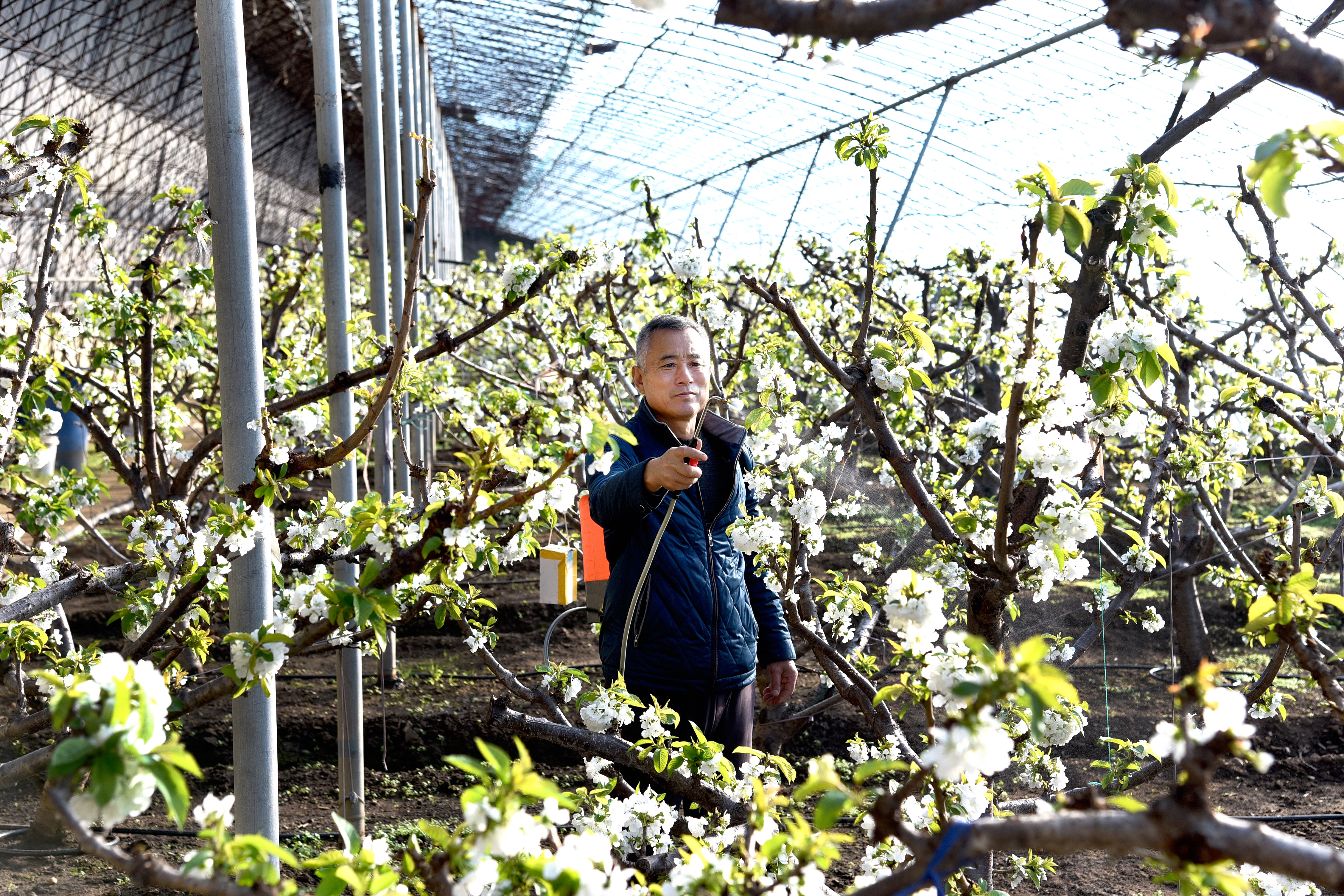 郭洪亮正在忙碌地给樱桃树授粉、剪枝和除草。他说,今年冬季气温较高,着重在温控技术方面需要提升改善,在提早授粉的基础上果实也会较往年早一个月成熟,预计明年3月中旬即可采摘。