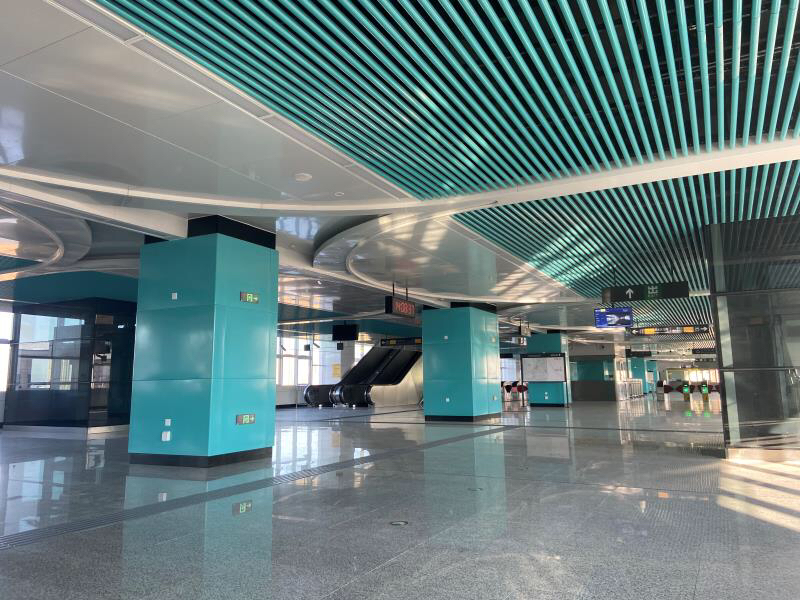 走进三十里堡站,第一感觉就是宽敞明亮,站厅内淡蓝色的立柱格外吸引眼球,顶棚采用波浪形的设计。仅一站之隔的石河黄旗站,站厅立柱颜色则采用翠绿色,进站口棚顶设计为镂空样式,让阳光直射进车站。13号线打破传统车站单一颜色设计模式,每座车站采用不同装饰风格和搭配不同的颜色,突出“一站一特色”,欢迎大家一一来解锁。