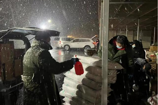 夜色深沉大雪纷飞中大连大学北门物资中转站,来往穿梭着一道道紧张忙碌的身影,他们是总务处消杀转运队和伙食服务中心工作人员。