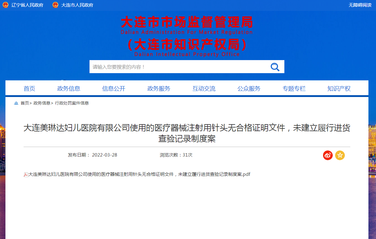 大连美琳达妇儿医院违规使用无合格证明文件注射针头被行政处罚