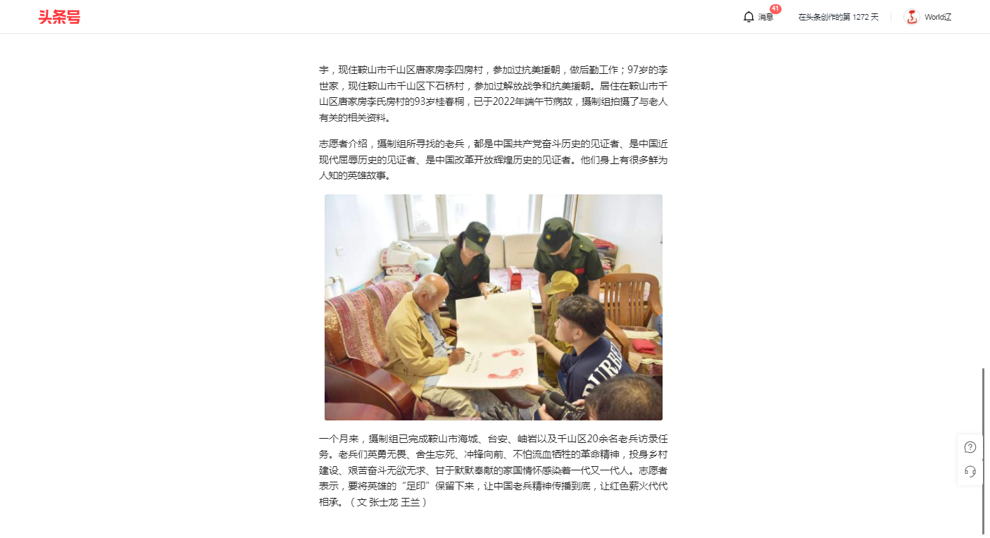 鞍山市退役军人事务局联合鞍山市千山区红色足迹拥军志愿者协会发起《寻访平凡老兵――弘扬中国精神》大型活动。“寻访平凡老兵”摄制组组建筹备之后,开始了“抢救性”的录制工作。