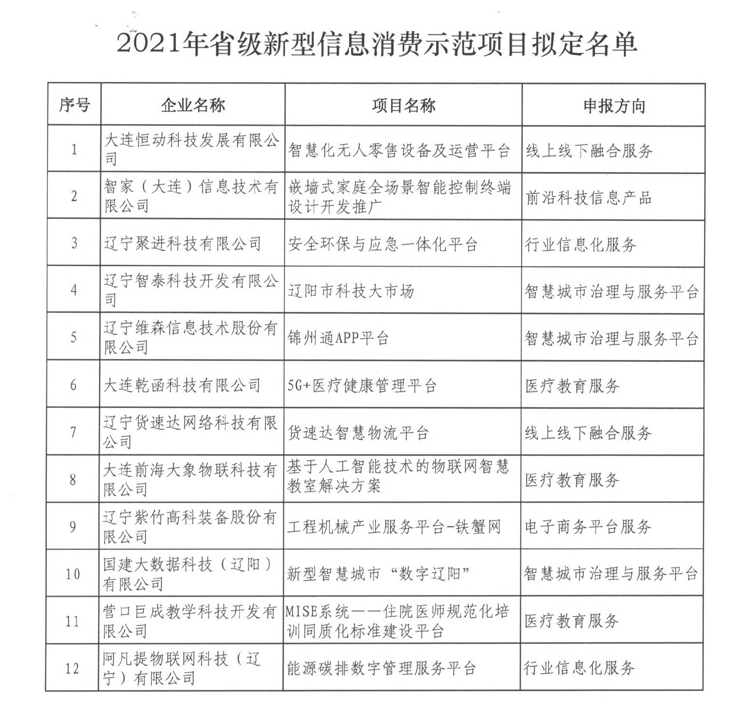 近日,辽宁省公示了2021年省级新型信息消费示范项目名单,大连恒动科技发展有限公司等12家企业入选。