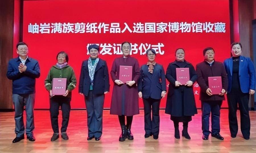 11月11日,辽宁岫岩满族自治县政协与县文化馆在玉都花熙文旅小镇小剧场举行8幅岫岩满族剪纸入选中国国家博物馆收藏颁发证书仪式。