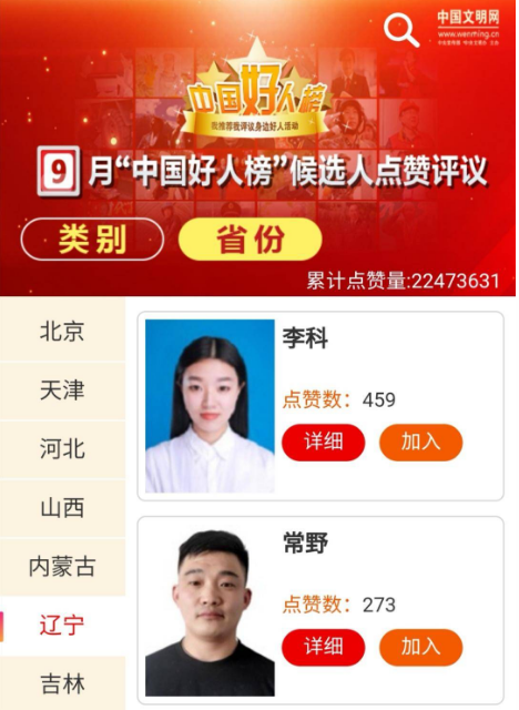 辽宁省的李科、常野、韩兴博、刘红、荆广春、许春刚、王连明分别成为此次活动“见义勇为”、“助人为乐”、“敬业奉献”、“孝老爱亲”、“诚实守信”的候选人。