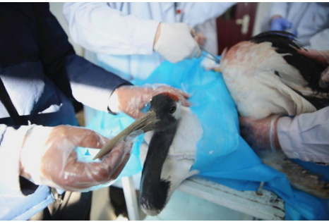 一只来自辽河口国家级自然保护区丹顶鹤野化基地的丹顶鹤,在大洼区中医院接受手术后,成功保住性命。