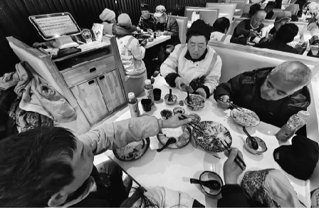 包场干饭:“鳗鱼炒饭”“三文鱼炒饭”“日式拉面”“乌冬面”“炸猪排”……11月9日中午,在奥体中心附近进行清扫工作的沈阳市浑南区龙马华清环卫公司的环卫工人难得地一起聚了个餐!